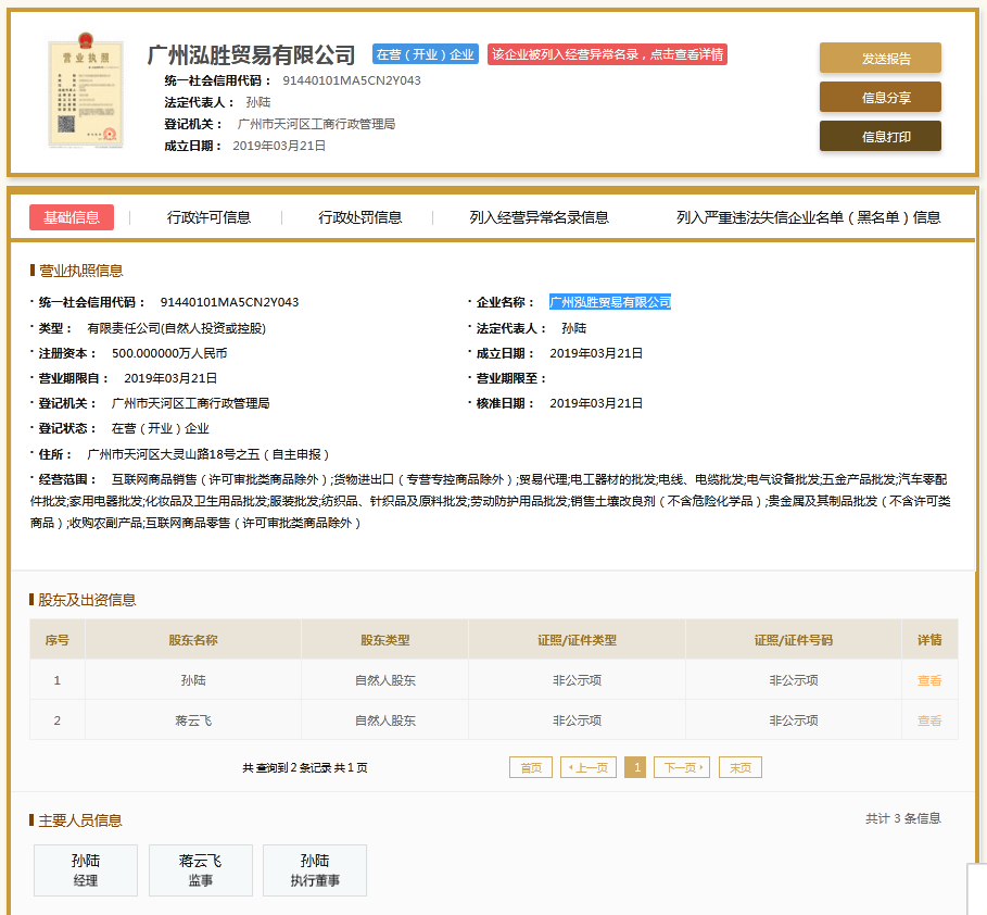 | 公司名称 | 广州泓胜贸易有限公司 | 信用代码 | 91440101MA5CN2Y043 |