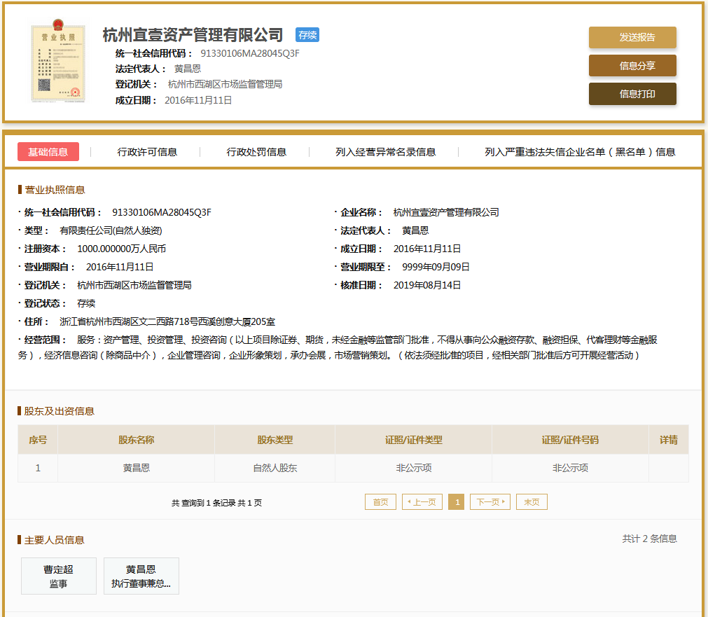 | 公司名称 | 杭州宜壹资产管理有限公司 | 信用代码 | 91330106MA28045Q3F |
