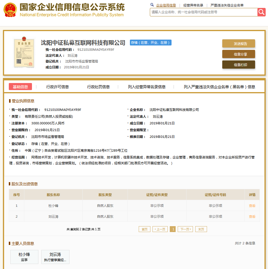 | 公司名称 | 沈阳中证私募互联网科技有限公司 | 信用代码 | 91210100MA0YEAYR9F |