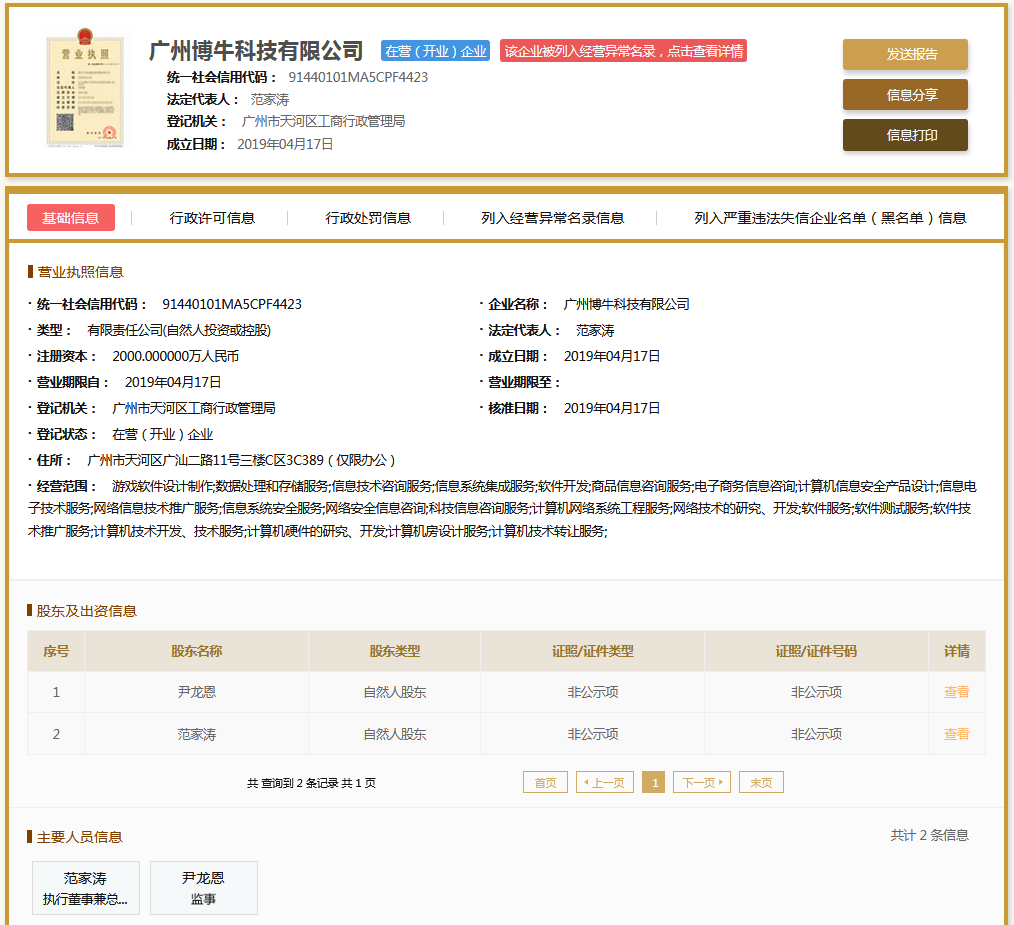 | 公司名称 | 广州博牛科技有限公司 | 信用代码 | 91440101MA5CPF4423 |