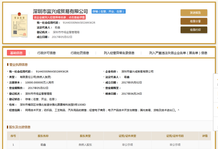 | 公司名称 | 深圳市富兴成贸易有限公司 | 信用代码 | 91440300MA5EGWKW2R |