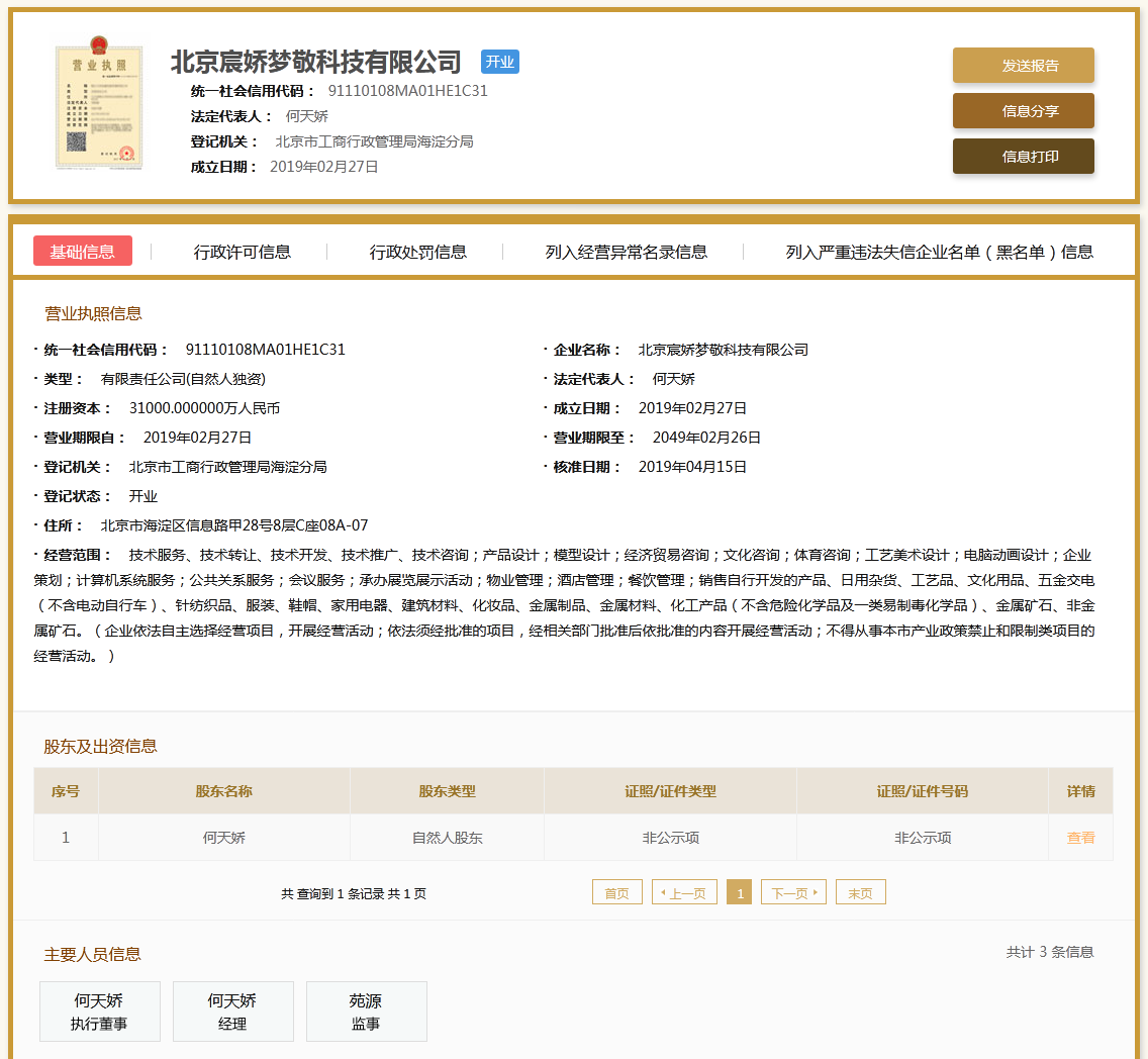 | 经营状态 | 在业 | 法人代表 | 何天娇 |