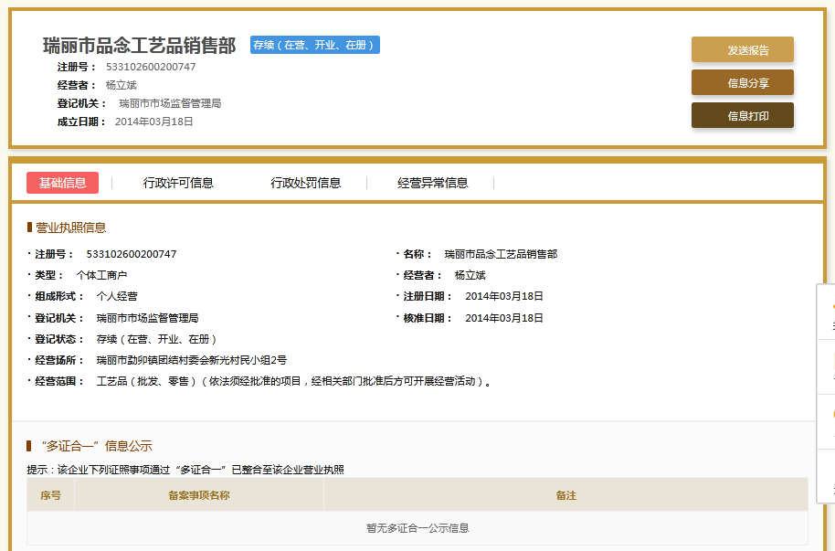 | 公司名称 | 瑞丽市品念工艺品销售部 | 信用代码 | 533102600200747 |
