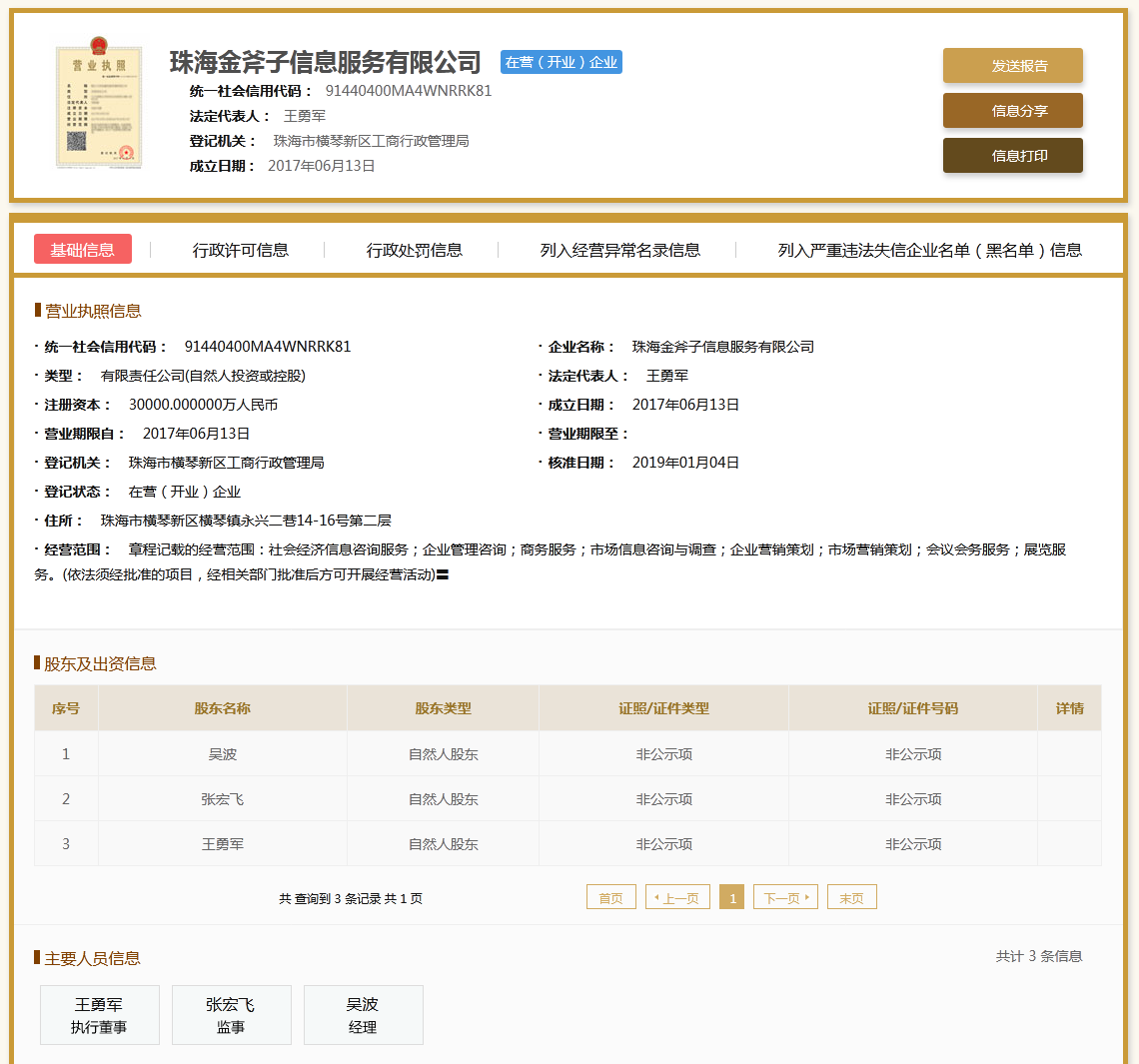 | 公司名称 | 珠海金斧子信息服务有限公司 | 信用代码 | 91440400MA4WNRRK81 |