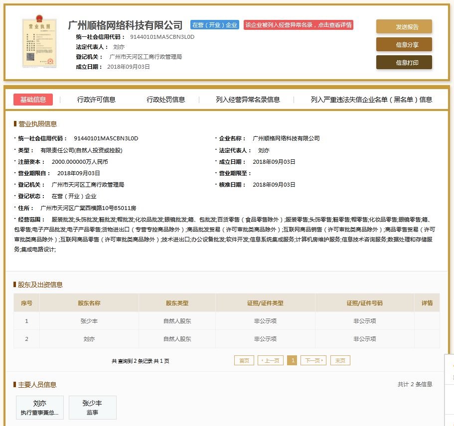 | 公司名称 | 广州顺格网络科技有限公司 | 信用代码 | 91440101MA5CBN3L0D |