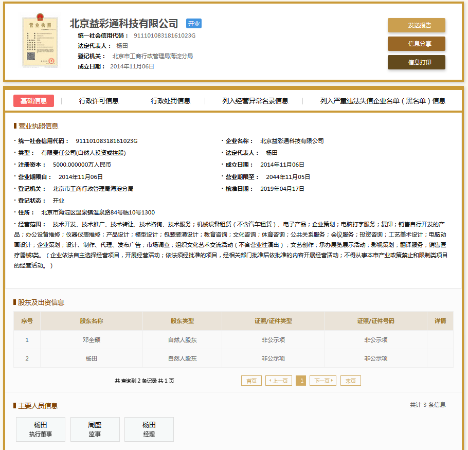 | 公司名称 | 北京益彩通科技有限公司 | 信用代码 | 91110108318161023G |