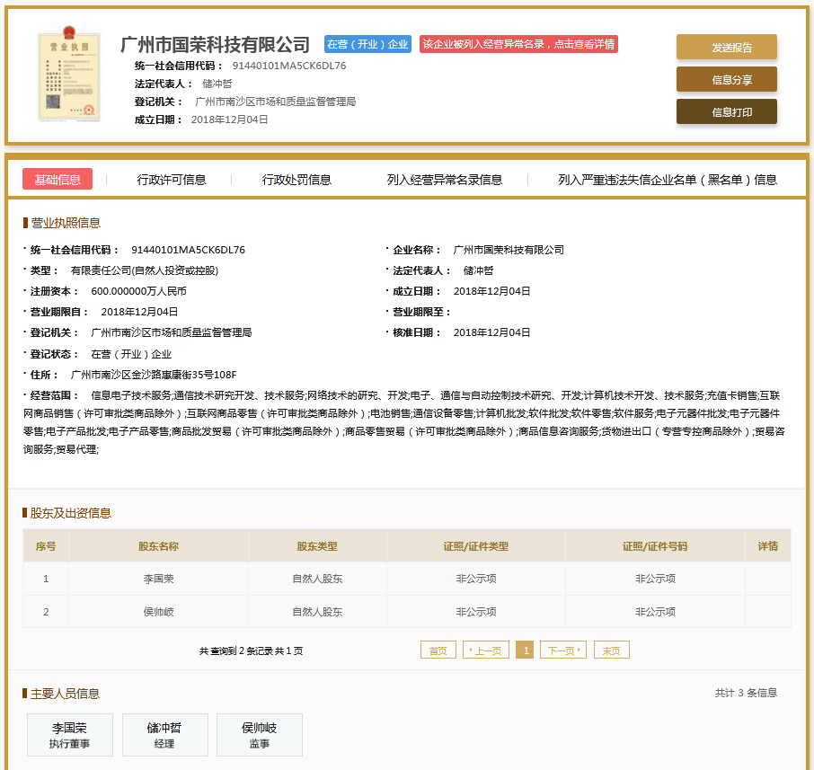 | 公司名称 | 广州市国荣科技有限公司 | 信用代码 | 91440101MA5CK6DL76 |