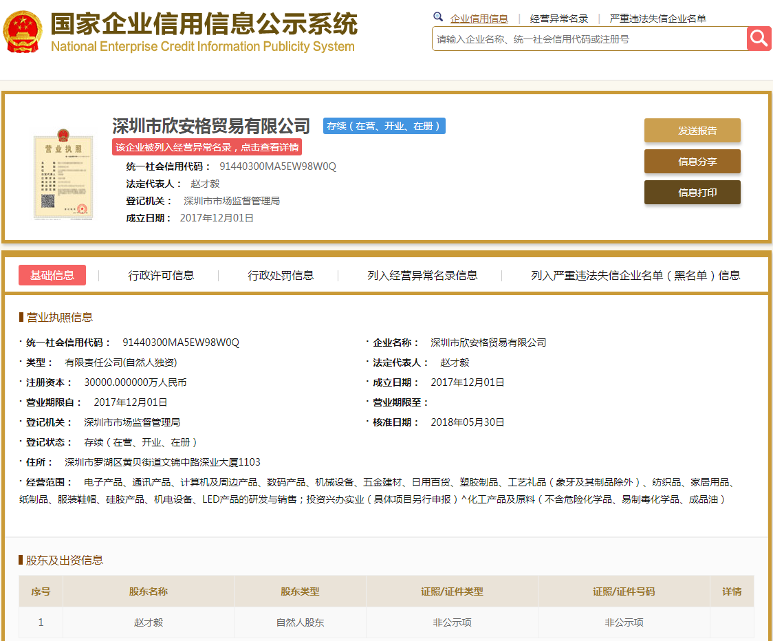 | 公司名称 | 深圳市欣安格贸易有限公司 | 信用代码 | 91440300MA5EW98W0Q |