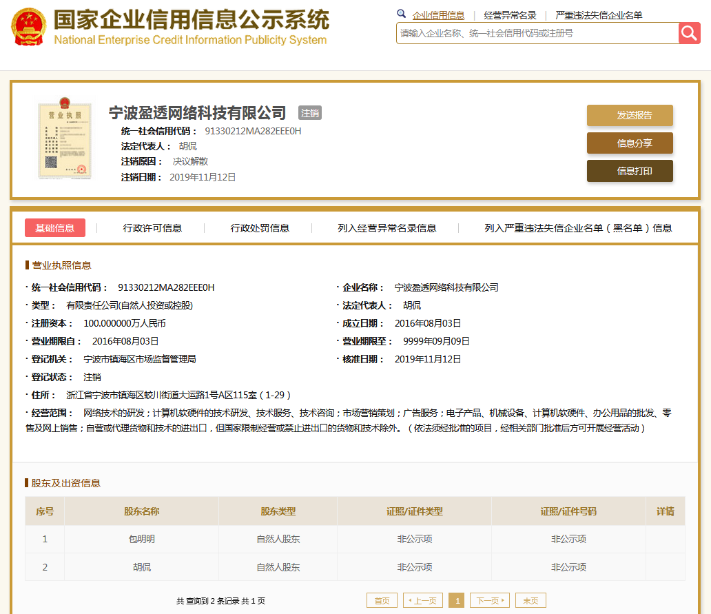 | 公司名称 | 宁波盈透网络科技有限公司 | 信用代码 | 91330212MA282EEE0H |