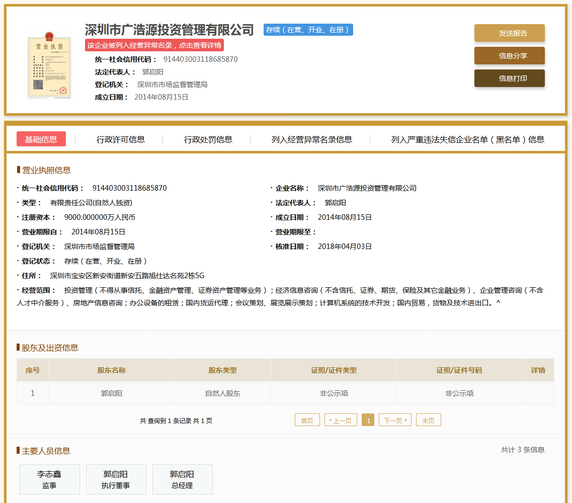 | 公司名称 | 深圳市广浩源投资管理有限公司 | 信用代码 | 914403003118685870 |