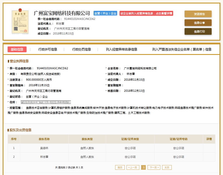 | 公司名称 | 广州富宝网络科技有限公司 | 信用代码 | 91440101MA5CJNCD62 |
