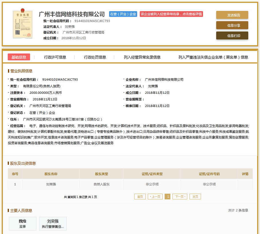 | 公司名称 | 广州丰信网络科技有限公司 | 信用代码 | 91440101MA5CJKCT93 |
