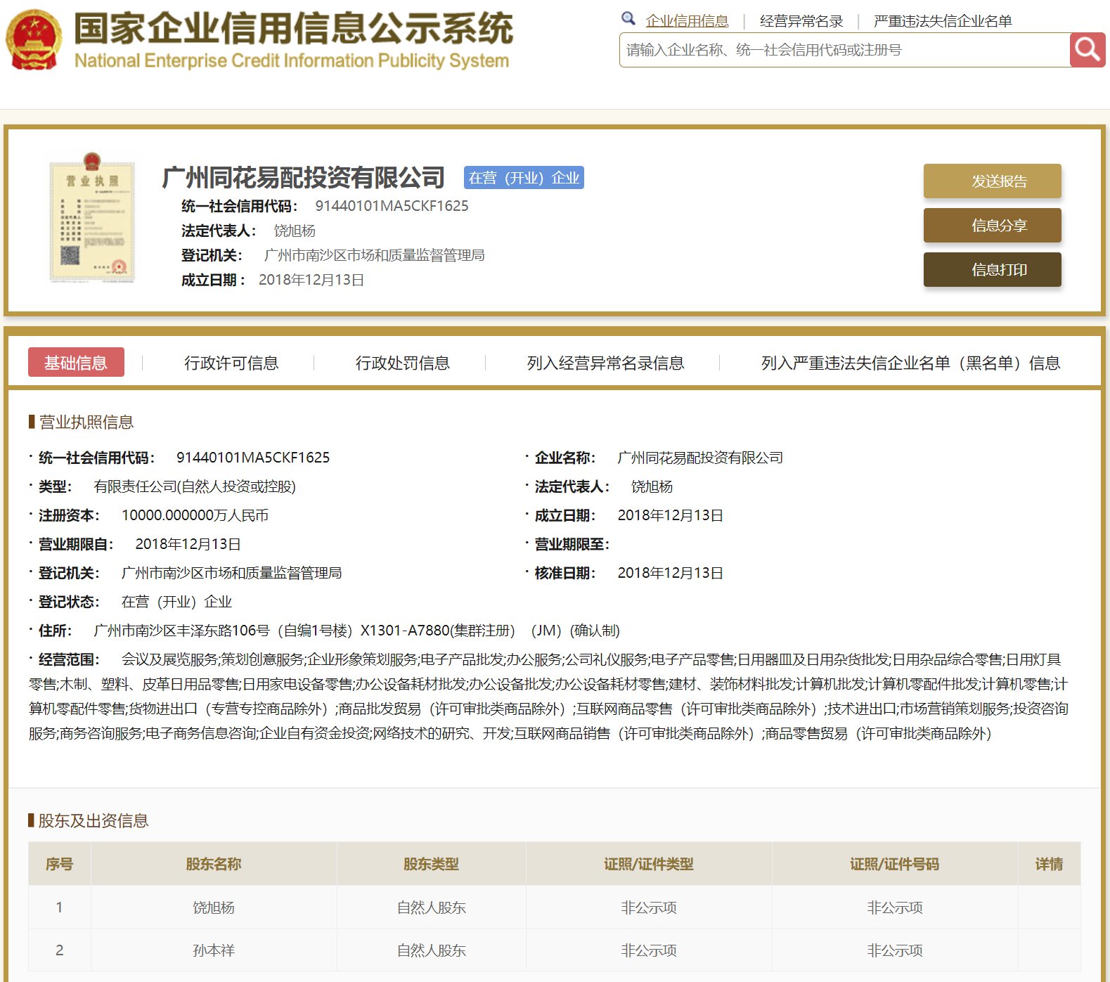| 公司名称 | 广州同花易配投资有限公司 | 信用代码 | 91440101MA5CKF1625 |