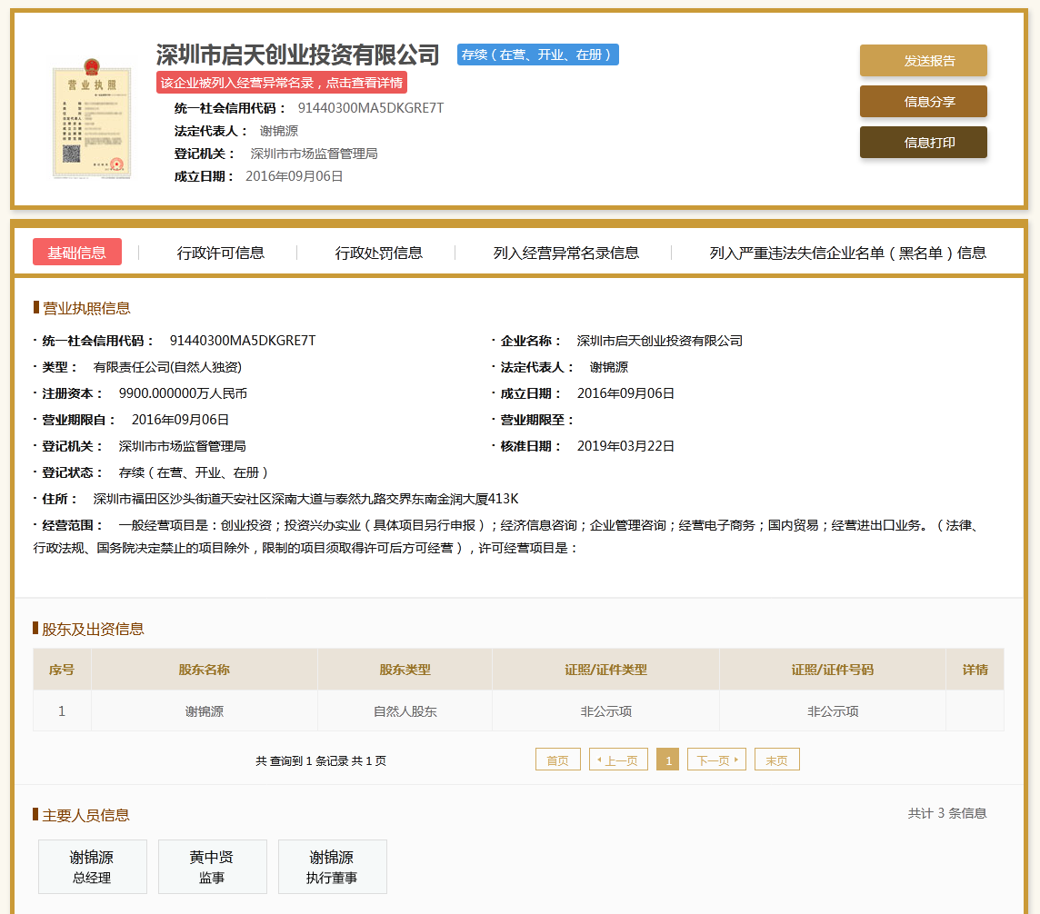 | 公司名称 | 深圳市启天创业投资有限公司 | 信用代码 | 91440300MA5DKGRE7T |