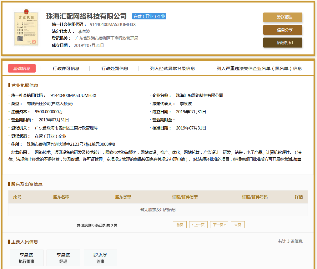 | 公司名称 | 珠海汇配网络科技有限公司 | 信用代码 | 91440400MA53JUMH3X |