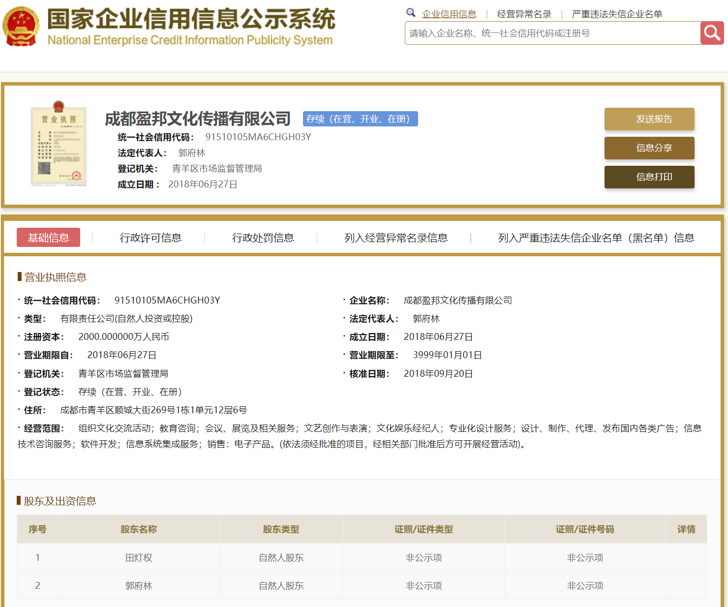 | 公司名称 | 成都盈邦文化传播有限公司 | 信用代码 | 91510105MA6CHGH03Y |
