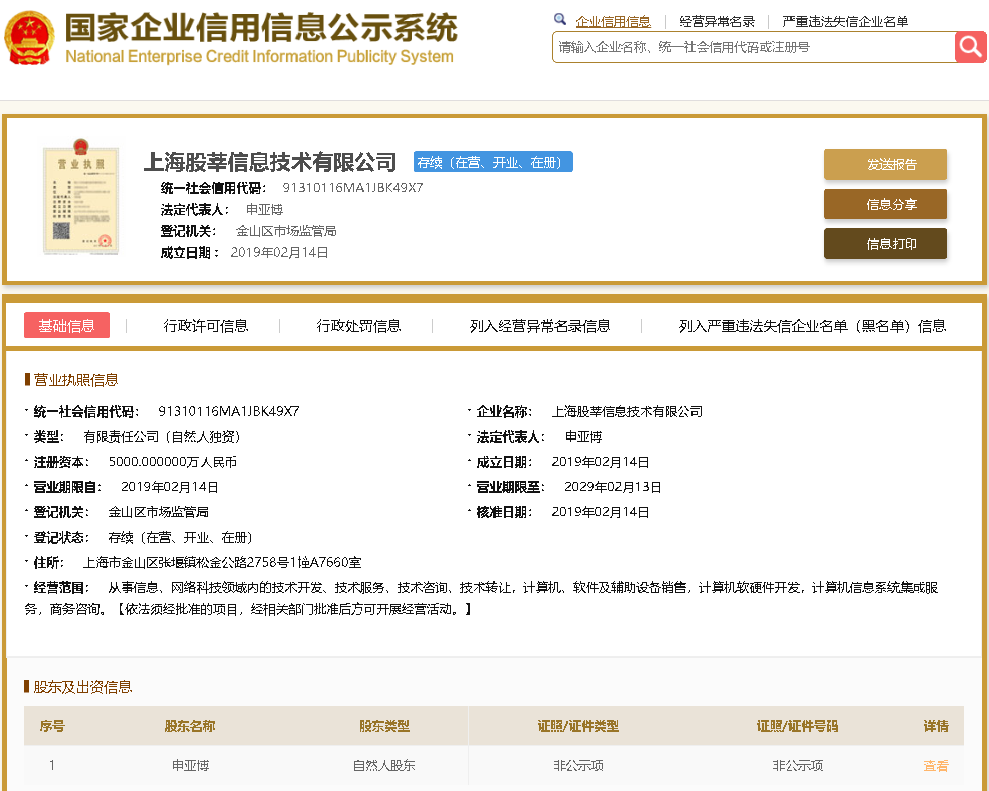 | 公司名称 | 上海股莘信息技术有限公司 | 信用代码 | 91310116MA1JBK49X7 |