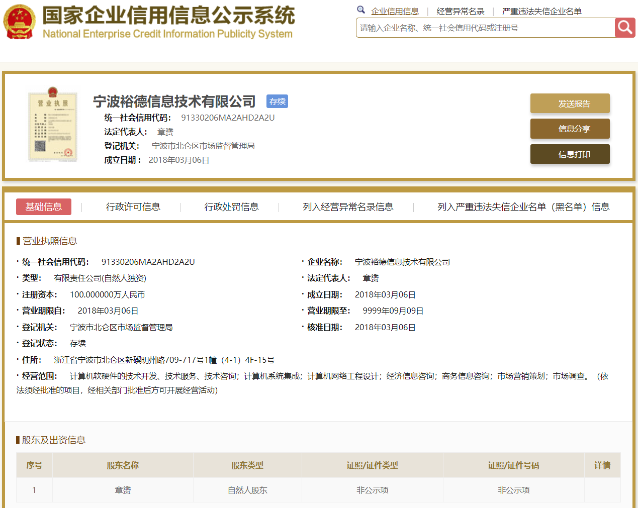 | 公司名称 | 宁波裕德信息技术有限公司 | 信用代码 | 91330206MA2AHD2A2U |