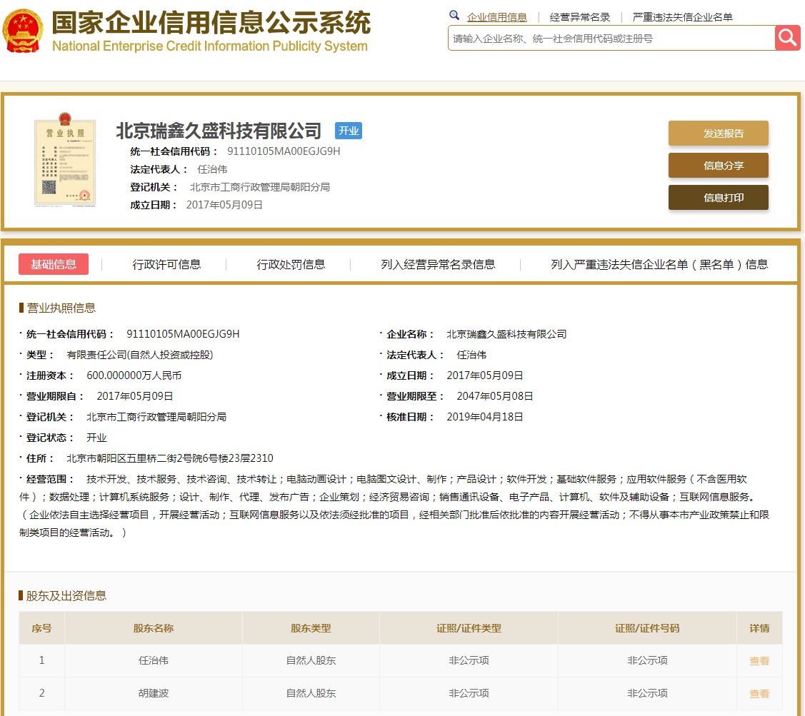 | 公司名称 | 北京瑞鑫久盛科技有限公司 | 信用代码 | 91110105MA00EGJG9H |
