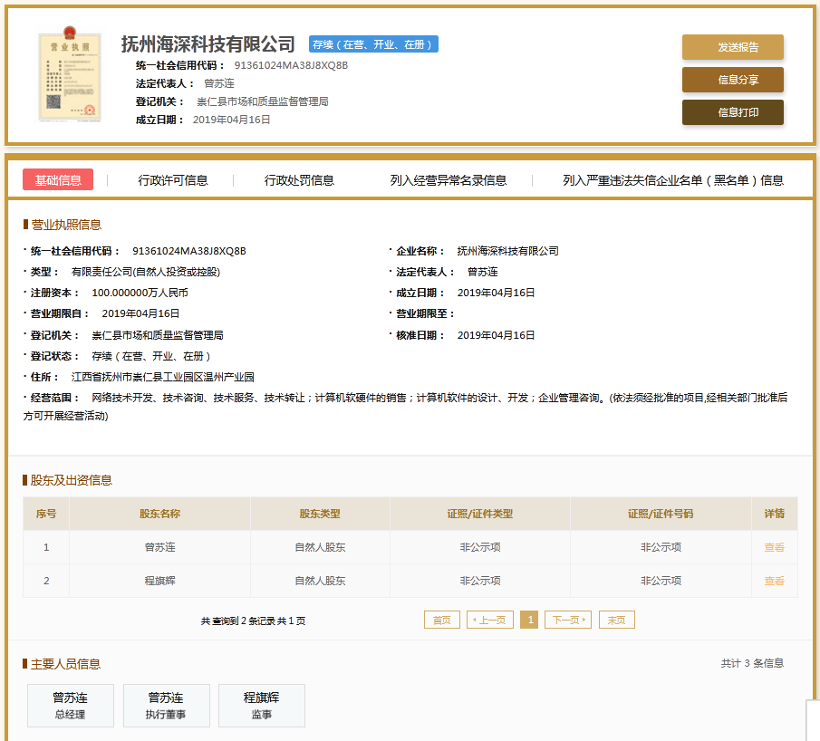 | 公司名称 | 抚州海深科技有限公司 | 信用代码 | 91361024MA38J8XQ8B |