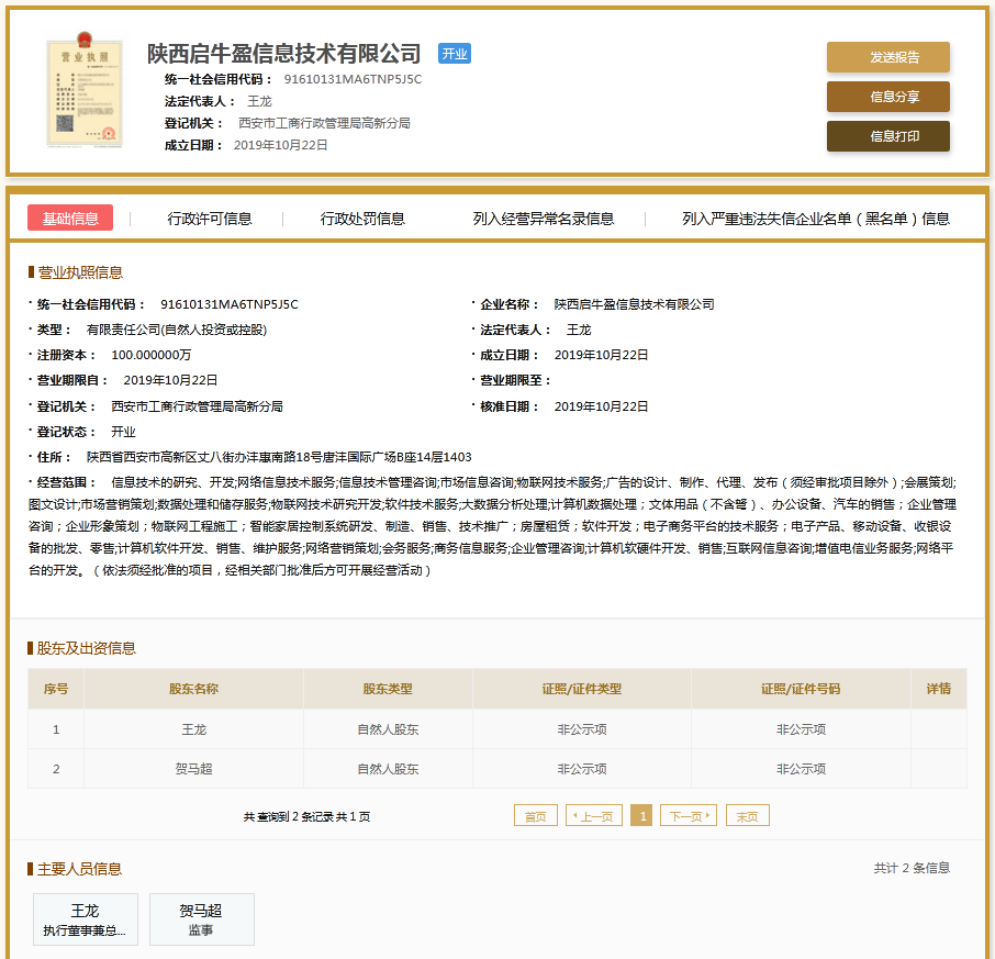 | 公司名称 | 陕西启牛盈信息技术有限公司 | 信用代码 | 91610131MA6TNP5J5C |