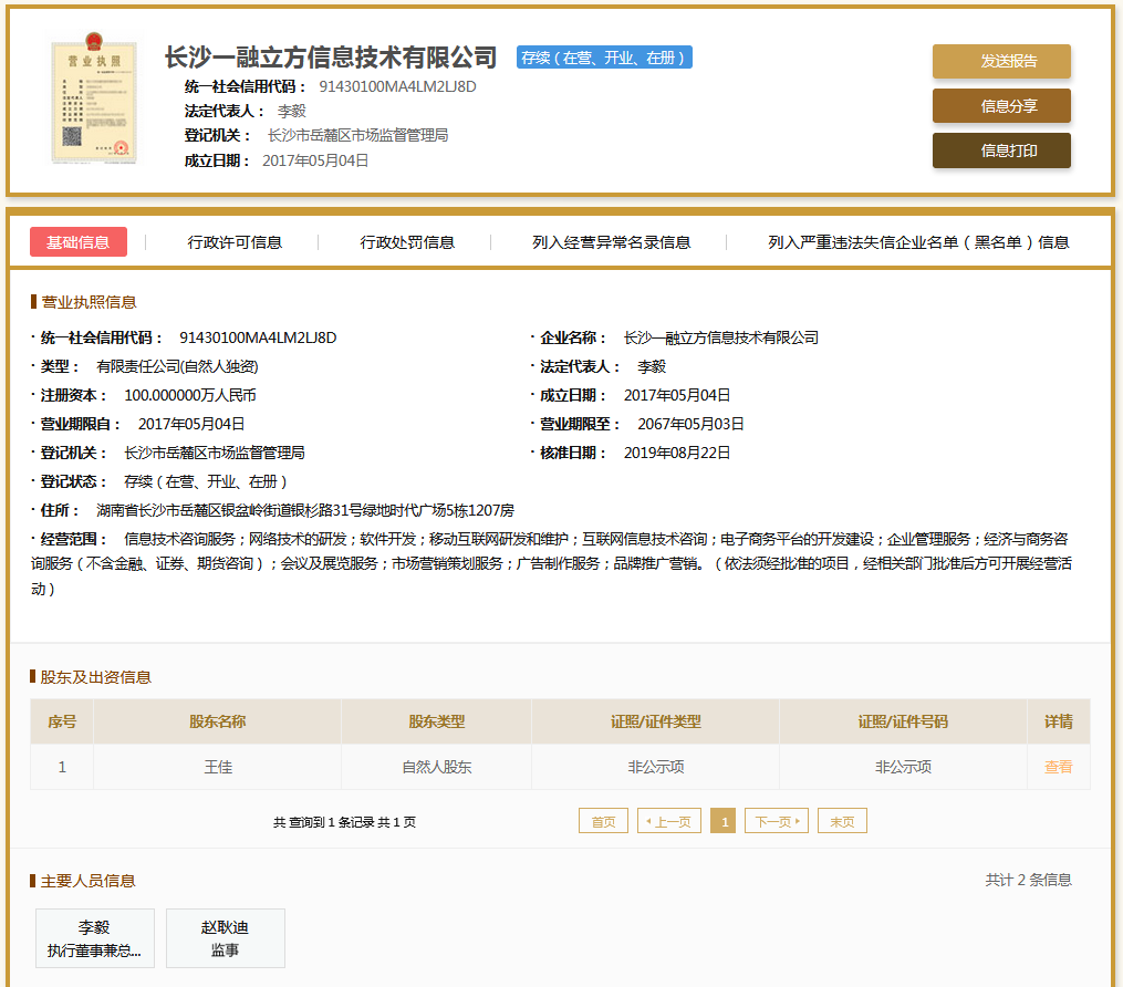 | 公司名称 | 长沙一融立方信息技术有限公司 | 信用代码 | 91430100MA4LM2LJ8D |