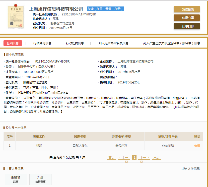 | 公司名称 | 上海旭祥信息科技有限公司 | 信用代码 | 91310106MA1FYH8Q8R |