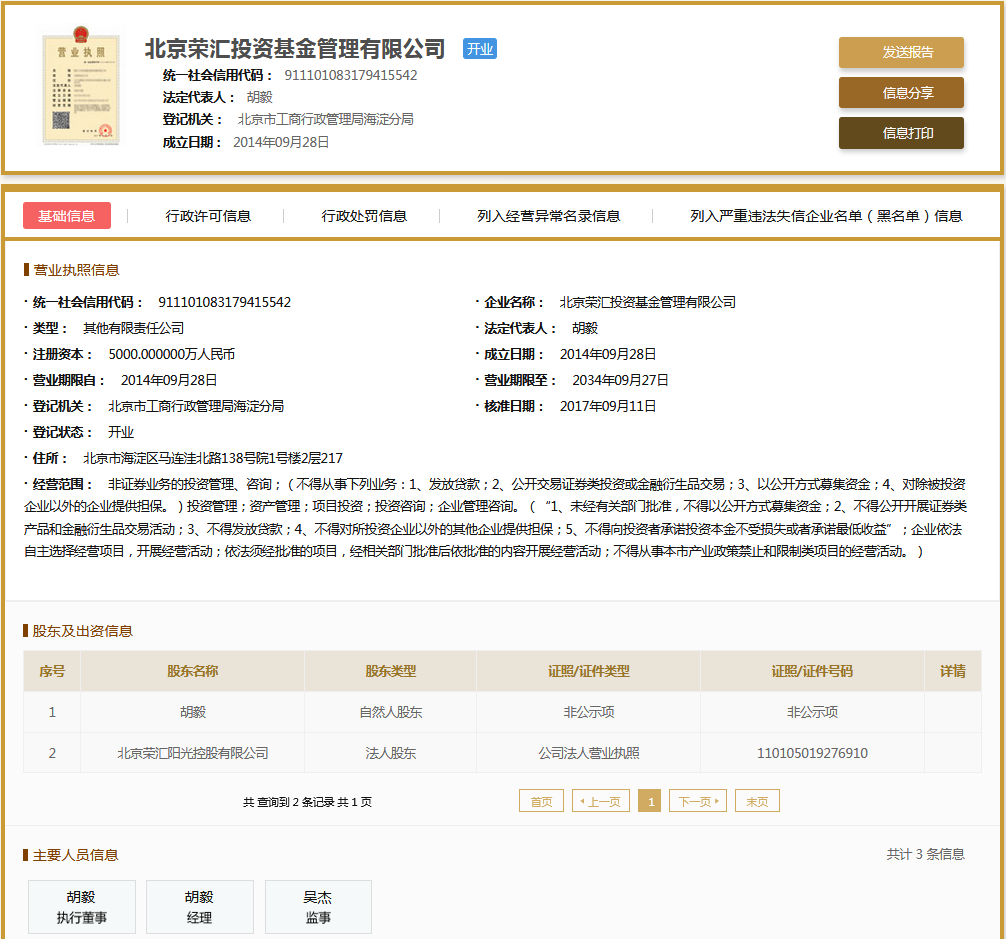 | 公司名称 | 北京荣汇投资基金管理有限公司 | 信用代码 | 911101083179415542 |