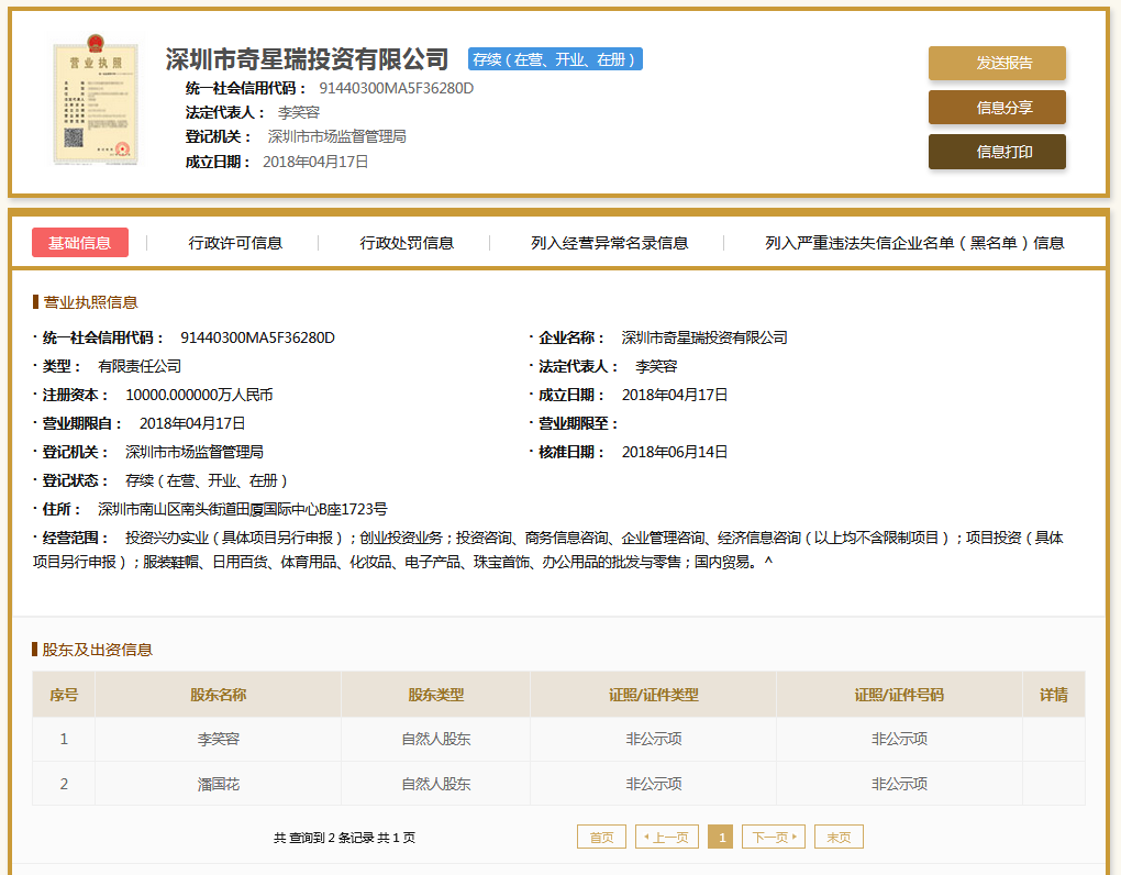 | 公司名称 | 深圳市奇星瑞投资有限公司 | 信用代码 | 91440300MA5F36280D |