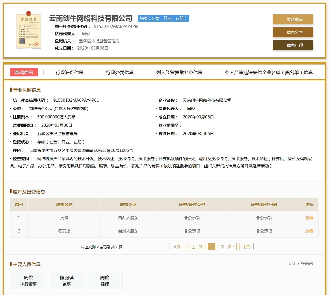 | 公司名称 | 云南创牛网络科技有限公司 | 信用代码 | 91530102MA6PAY4P8L |