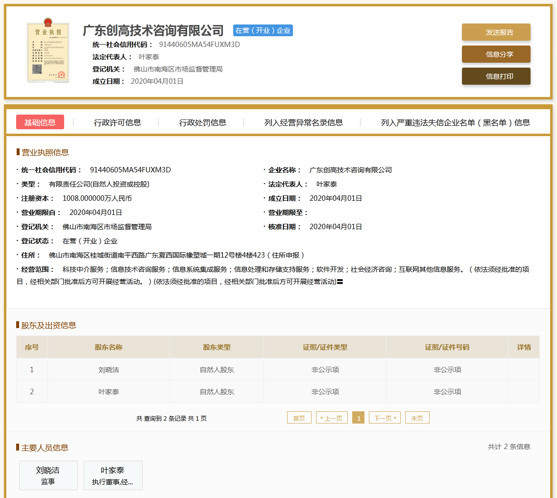 | 公司名称 | 广东创高技术咨询有限公司 | 信用代码 | 91440605MA54FUXM3D |