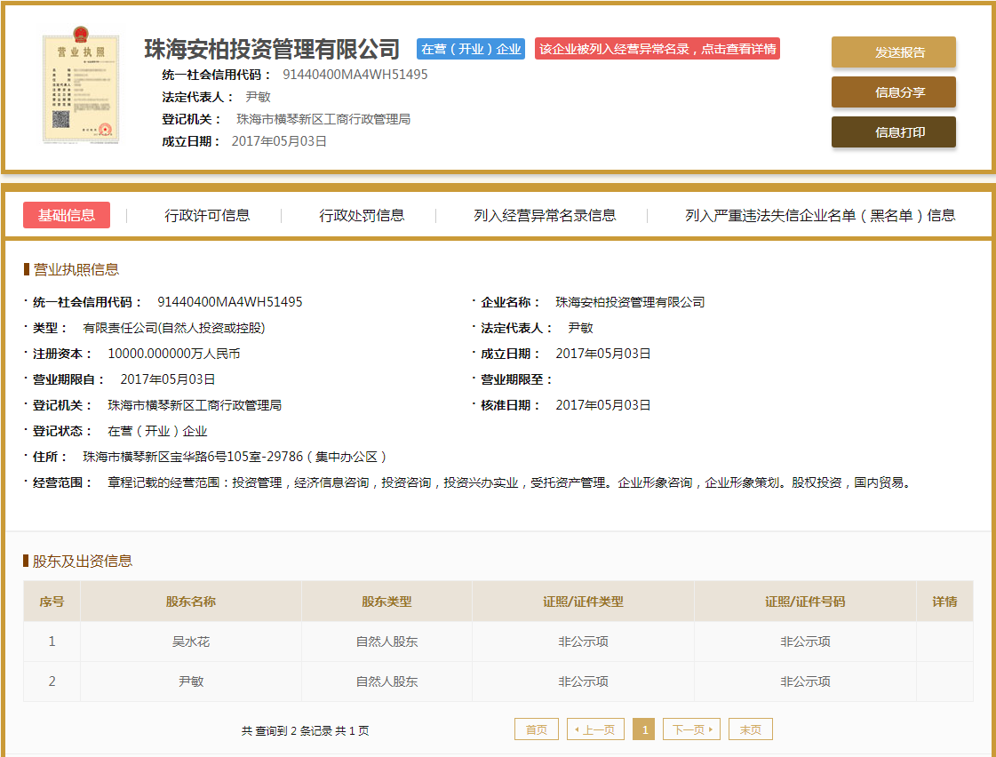 | 公司名称 | 珠海安柏投资管理有限公司 | 信用代码 | 91440400MA4WH51495 |