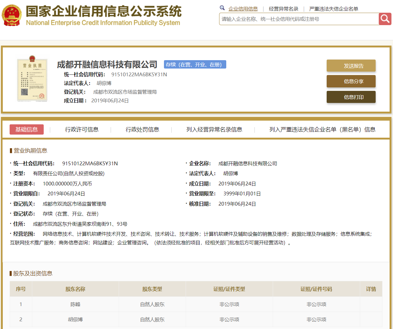 | 公司名称 | 成都开融信息科技有限公司 | 信用代码 | 91510122MA6BK5Y31N |