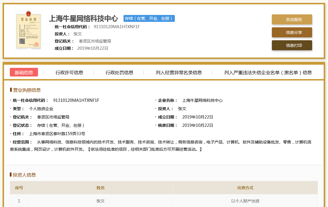 | 公司名称 | 上海牛星网络科技中心 | 信用代码 | 91310120MA1HTXNF1F |
