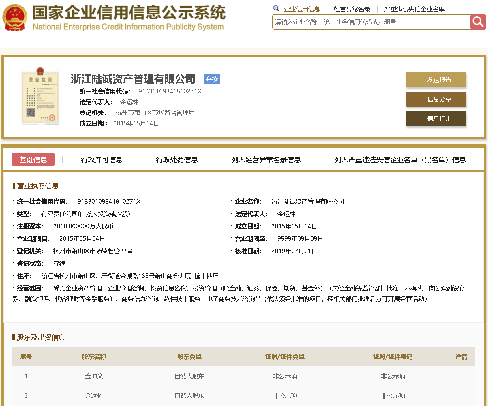 | 公司名称 | 浙江陆诚资产管理有限公司 | 信用代码 | 91330109341810271X |