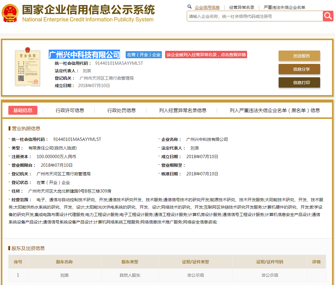 | 公司名称 | 广州兴中科技有限公司 | 信用代码 | 91440101MA5AYYML5T |