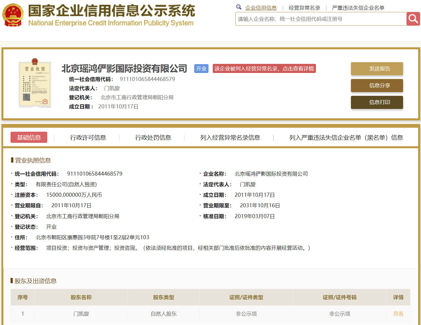 | 公司名称 | 北京瑶鸿俨影国际投资有限公司 | 信用代码 | 911101065844468579 |
