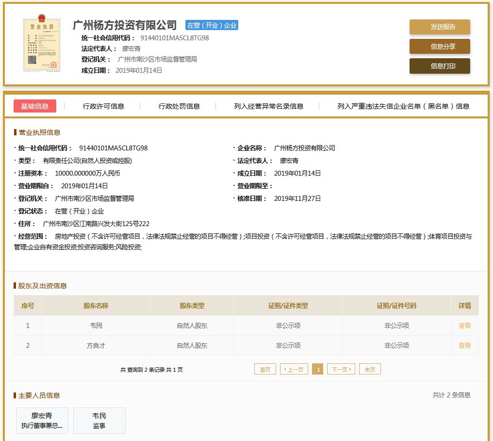 | 公司名称 | 广州杨方投资有限公司 | 信用代码 | 91440101MA5CL8TG98 |