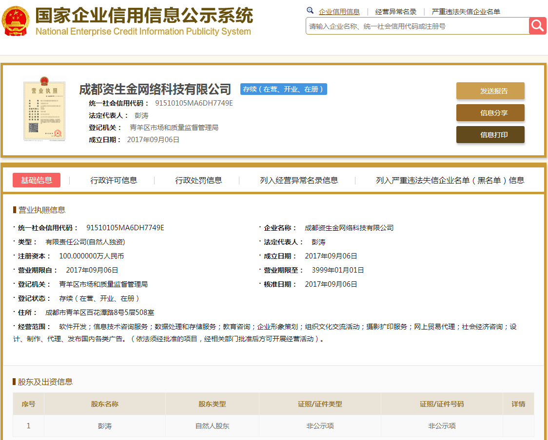 | 公司名称 | 成都资生金网络科技有限公司 | 信用代码 | 91510105MA6DH7749E |