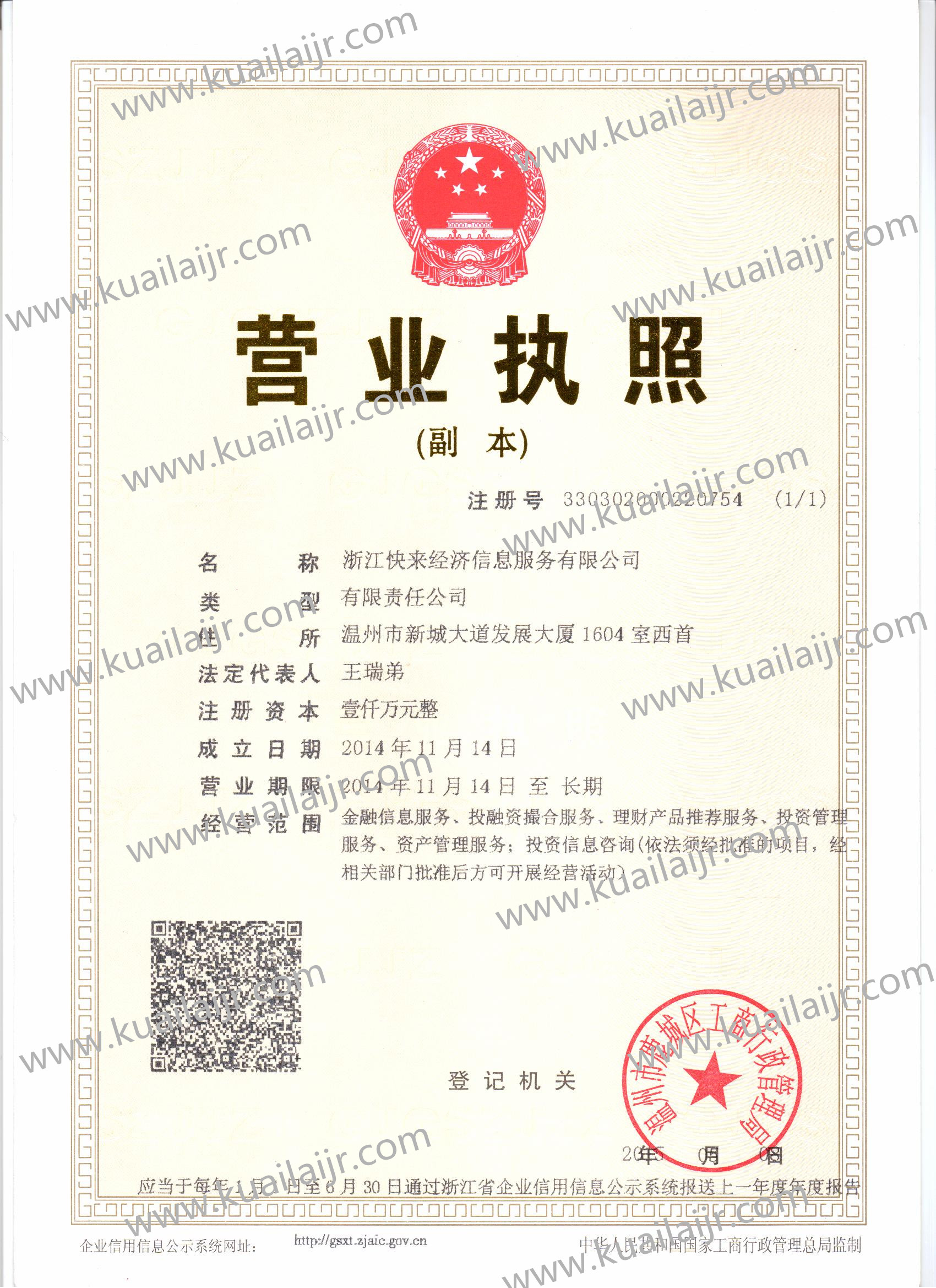 | 公司名称 | 浙江快来经济信息服务有限公司 | 信用代码 | 330302000220754 |