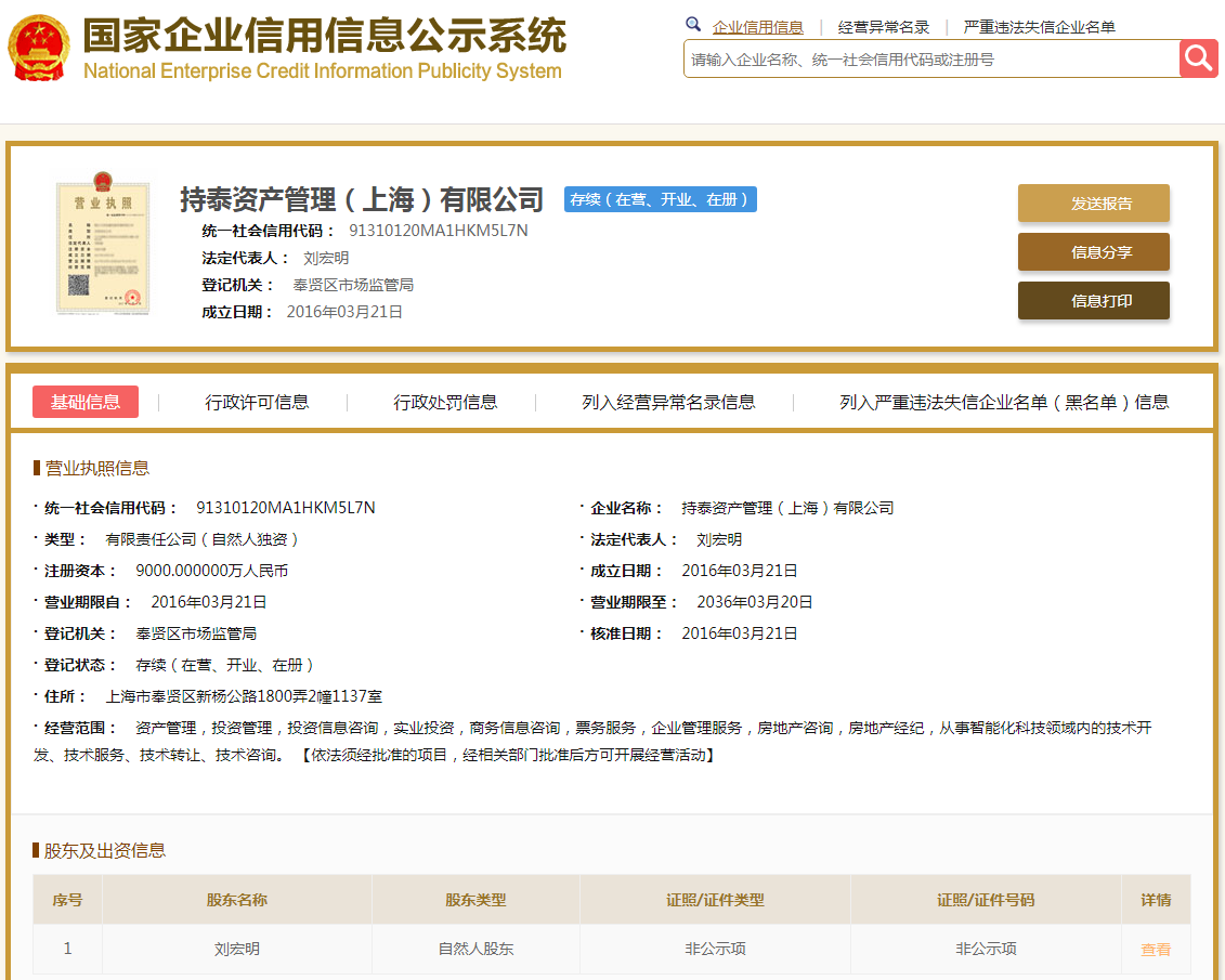 | 公司名称 | 持泰资产管理(上海)有限公司 | 信用代码 | 91310120MA1HKM5L7N |
