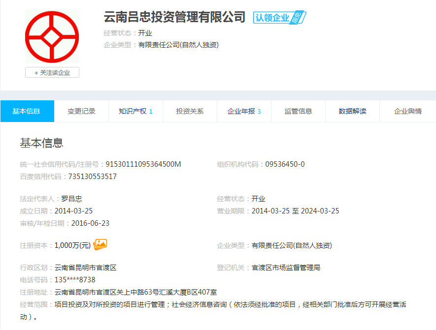 | 公司名称 | 云南吕忠投资管理有限公司 | 信用代码 | 91530111095364500M |
