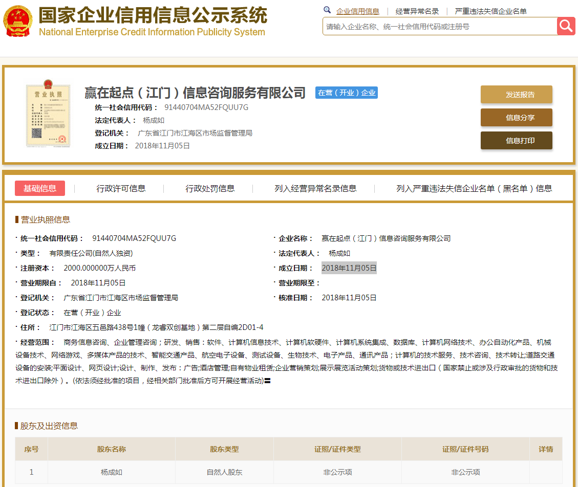 | 公司名称 | 赢在起点(江门)信息咨询服务有限公司 | 信用代码 | 91440704MA52FQUU7G |