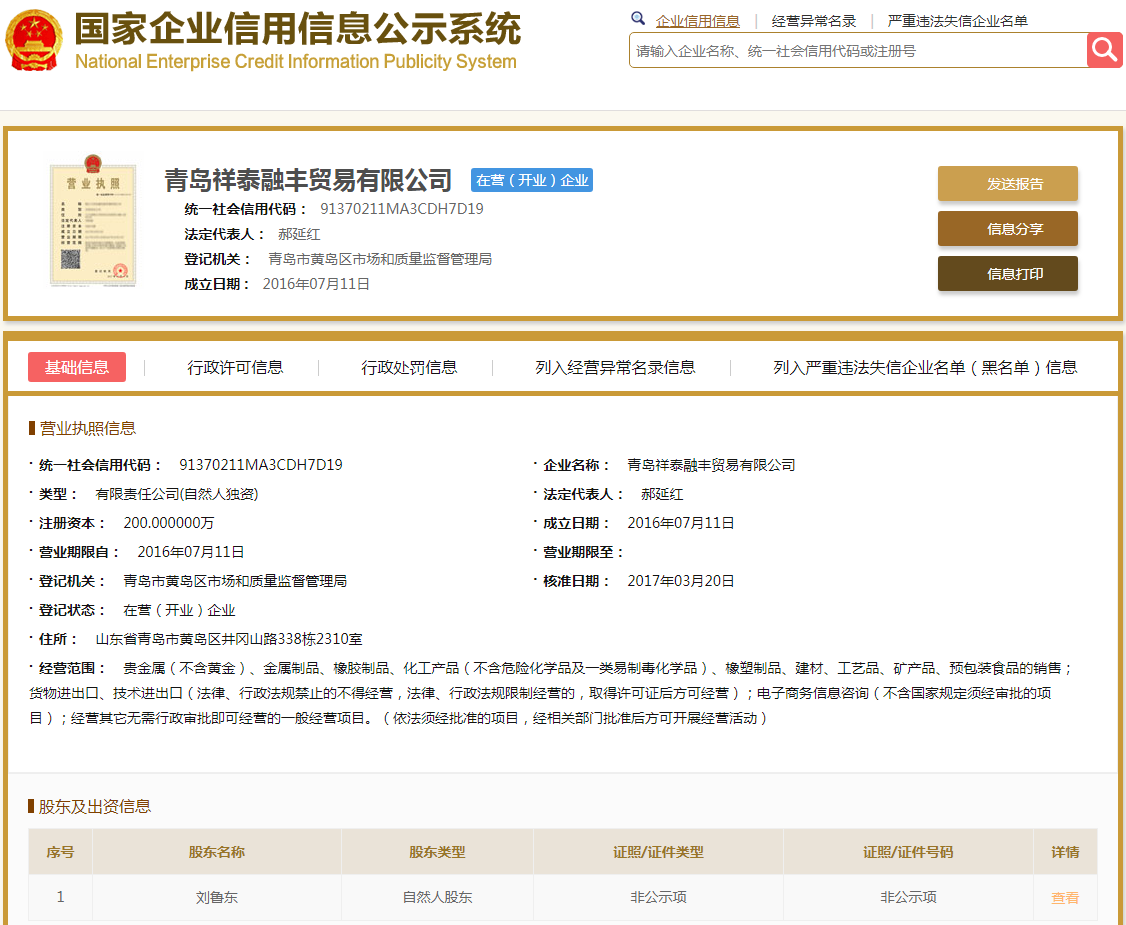| 公司名称 | 青岛祥泰融丰贸易有限公司 | 信用代码 | 91370211MA3CDH7D19 |