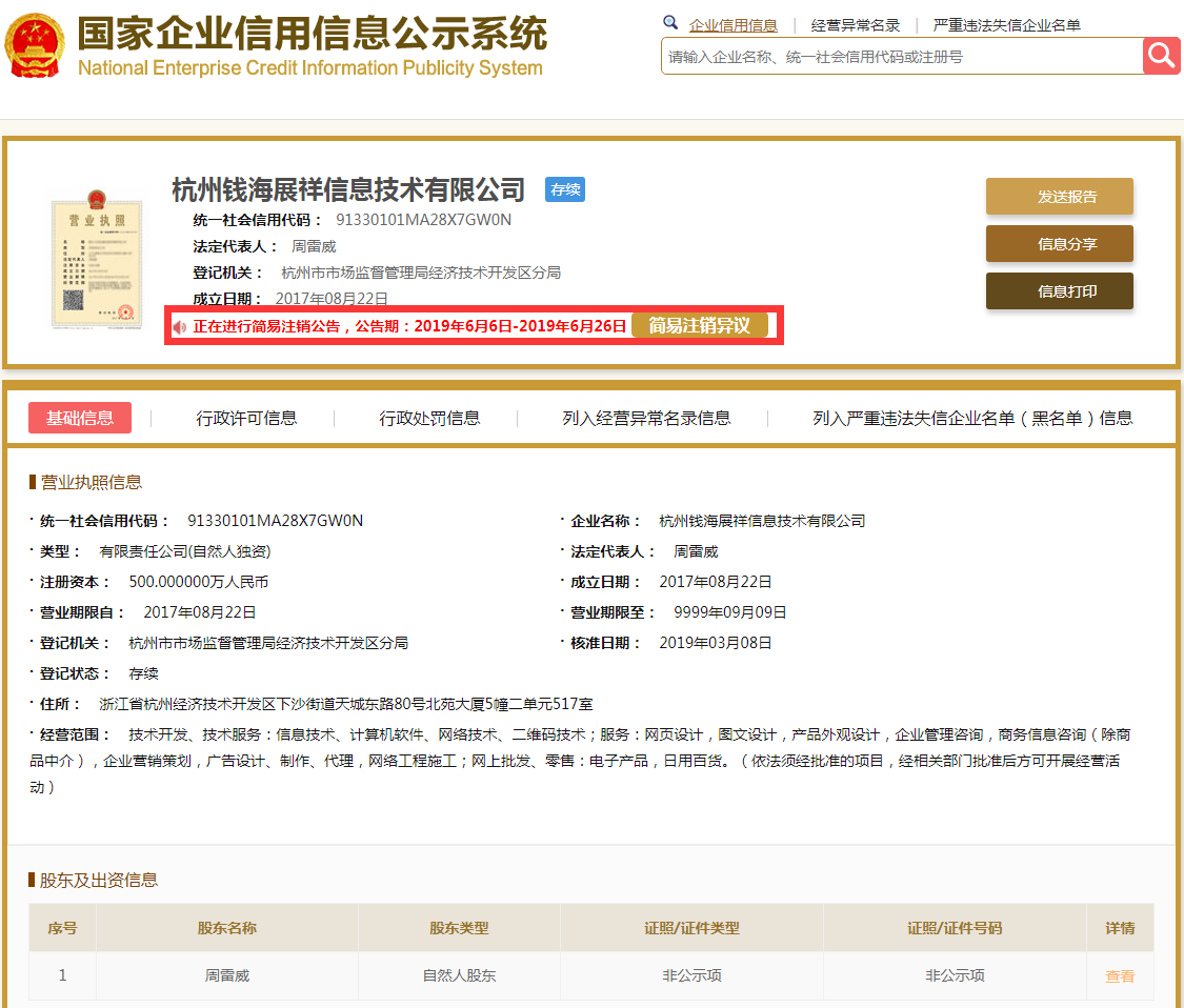 | 公司名称 | 杭州钱海展祥信息技术有限公司 | 信用代码 | 91330101MA28X7GW0N |