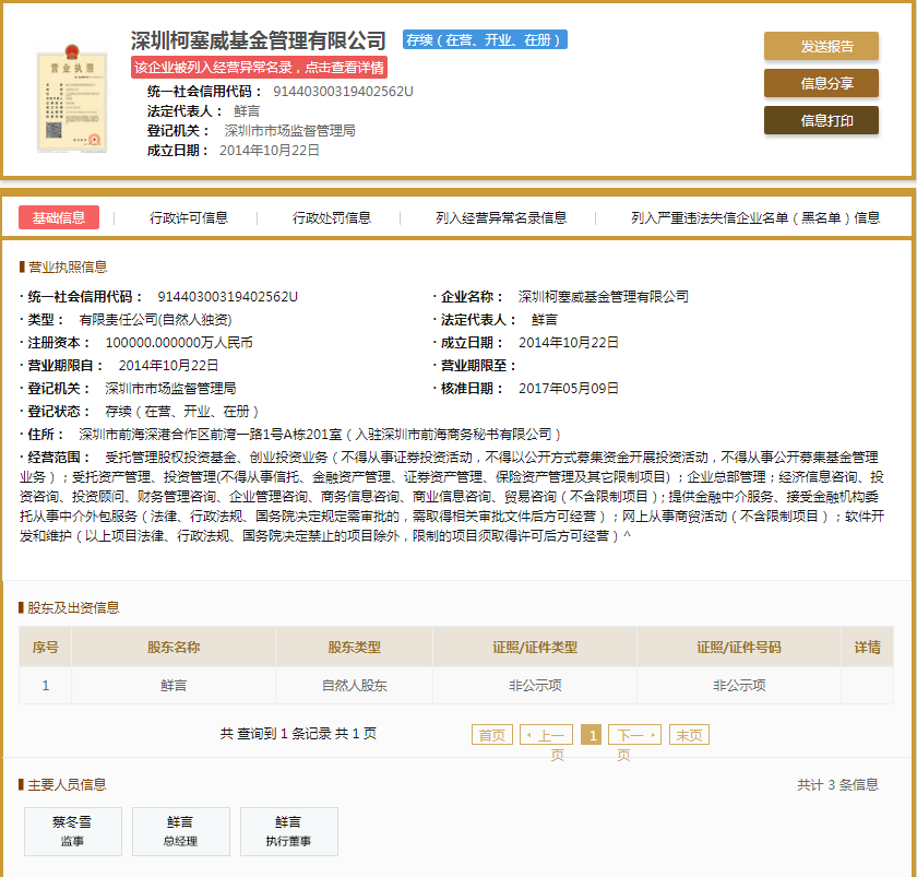 | 公司名称 | 深圳柯塞威基金管理有限公司 | 信用代码 | 91440300319402562U |