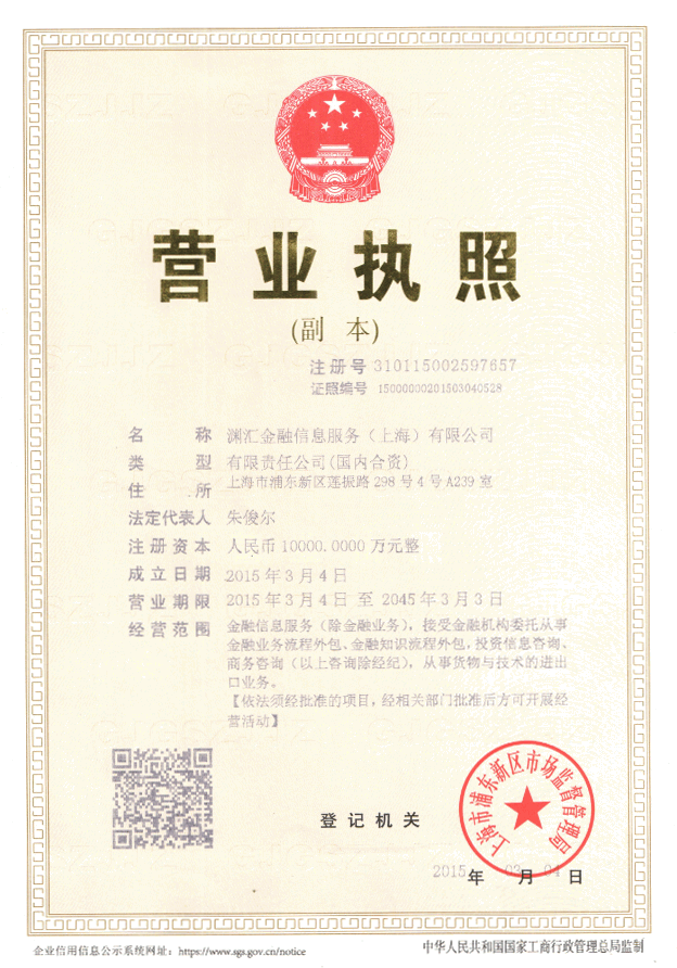 | 公司名称 | 渊汇金融信息服务(上海)有限公司 | 信用代码 | 913101153327943291 |