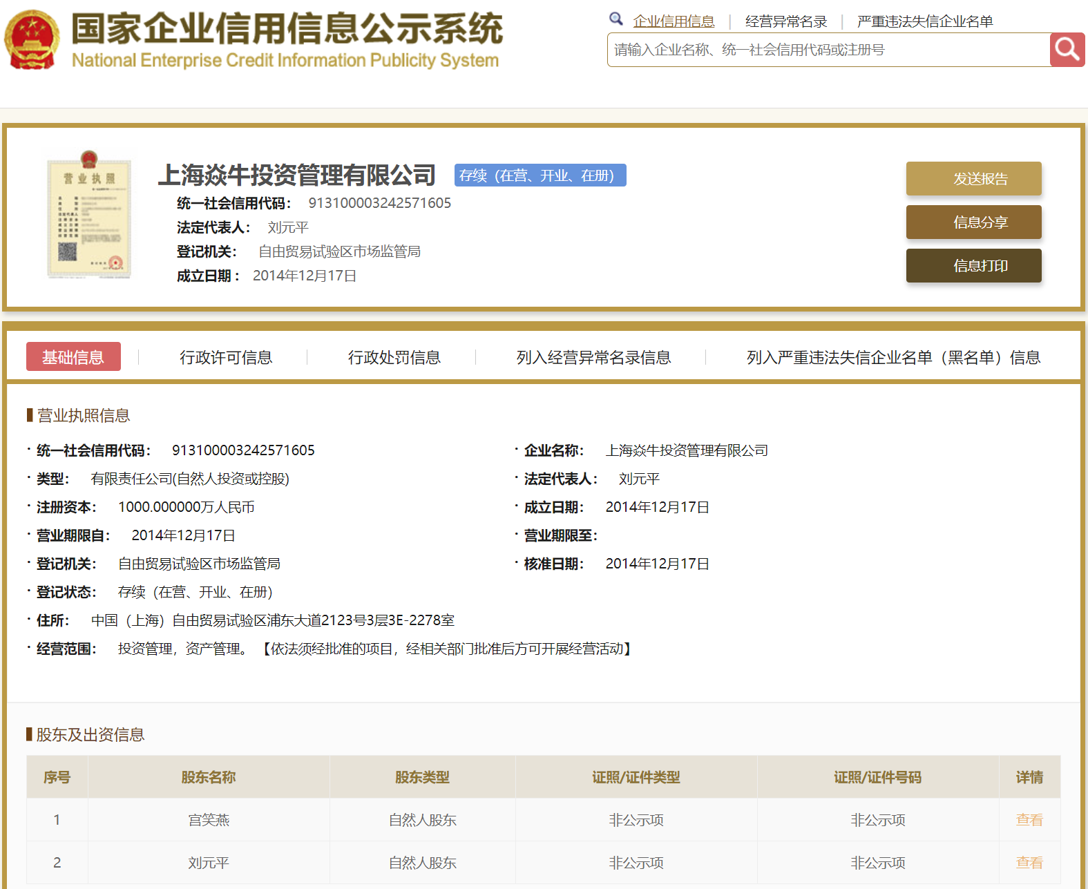 | 公司名称 | 上海焱牛投资管理有限公司 | 信用代码 | 913100003242571605 |