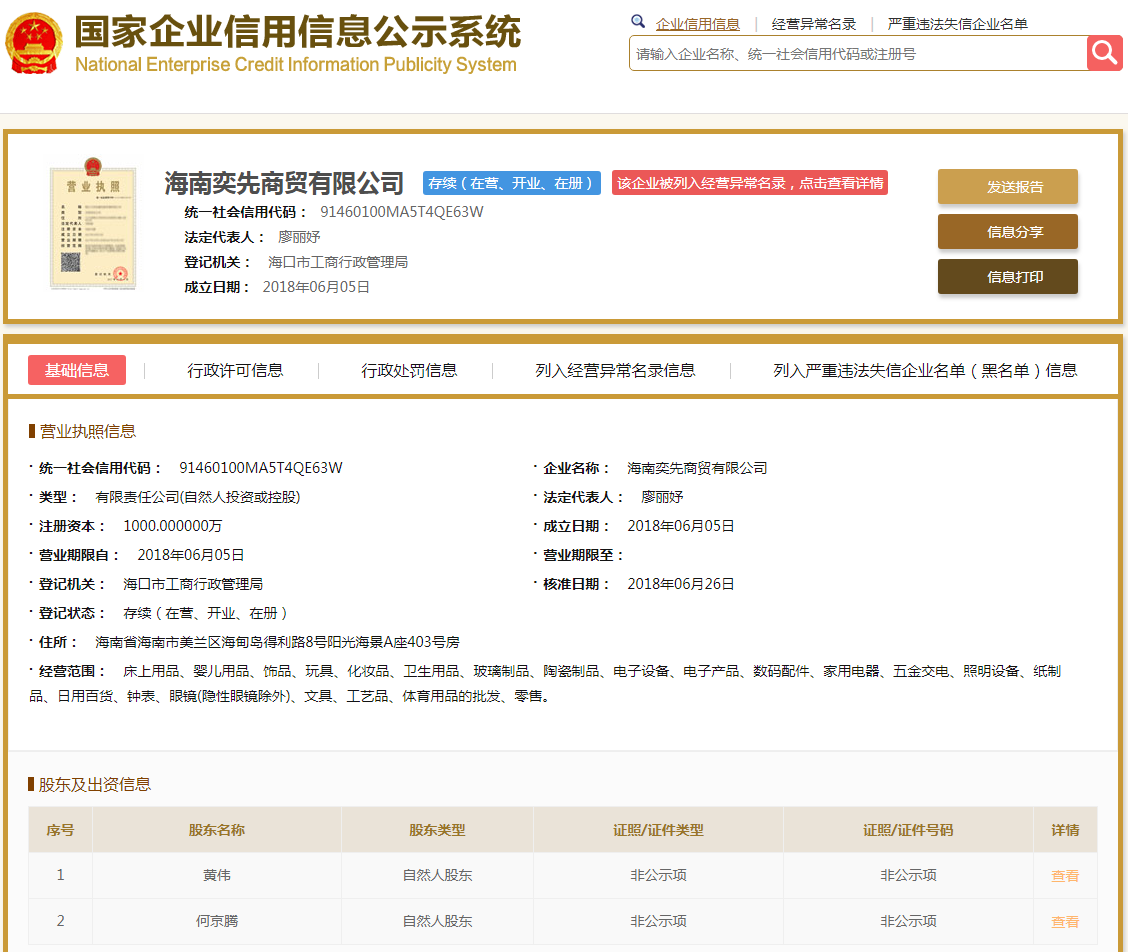 | 公司名称 | 海南奕先商贸有限公司 | 信用代码 | 91460100MA5T4QE63W |