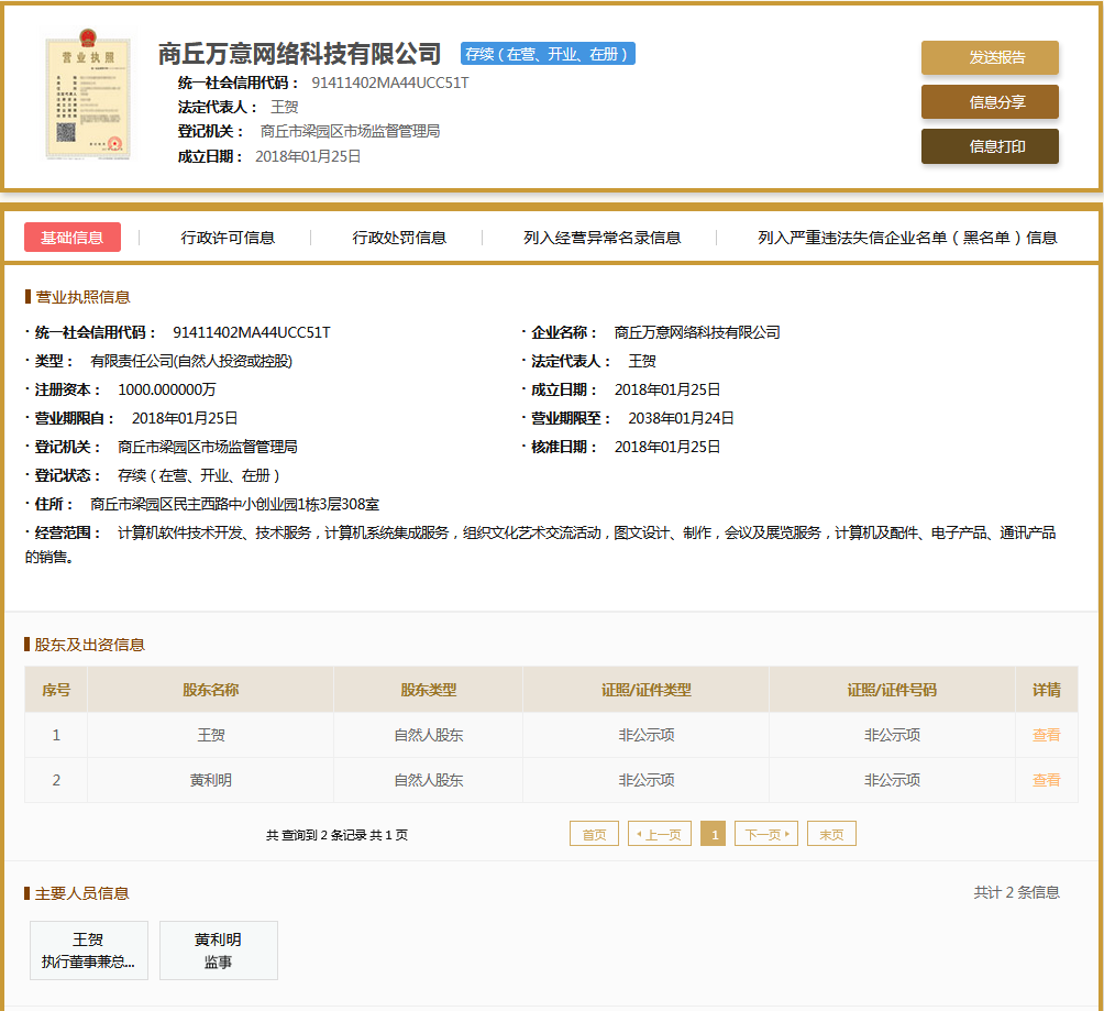 | 公司名称 | 商丘万意网络科技有限公司 | 信用代码 | 91411402MA44UCC51T |